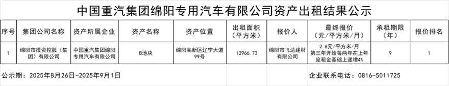 中國(guó)重汽集團(tuán)綿陽(yáng)專用汽車有限公司資產(chǎn)出租結(jié)果公示