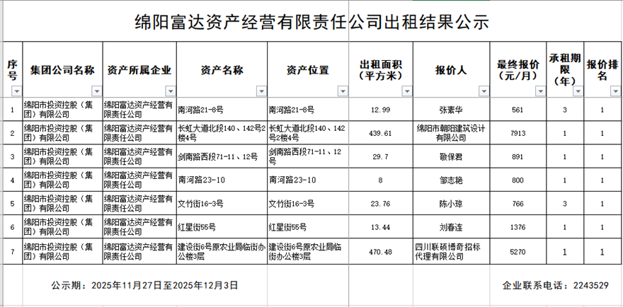 綿陽富達(dá)資產(chǎn)經(jīng)營有限責(zé)任公司出租結(jié)果公示