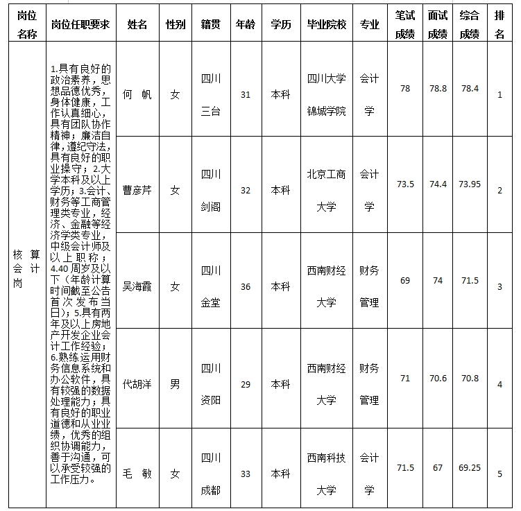 【公開(kāi)招聘】綿陽(yáng)市嘉遠(yuǎn)瑞華房地產(chǎn)開(kāi)發(fā)有限公司關(guān)于招聘核算會(huì)計(jì)崗測(cè)試成績(jī)的公示