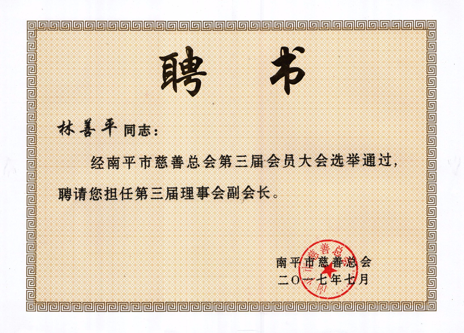 虹潤公司董事長林善平連續(xù)三屆當(dāng)選為南平市慈善總會副會長