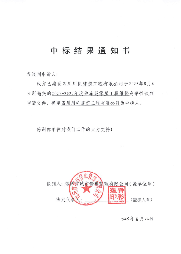 2025-2027年度停車場(chǎng)零星工程維修項(xiàng)目中標(biāo)結(jié)果通知
