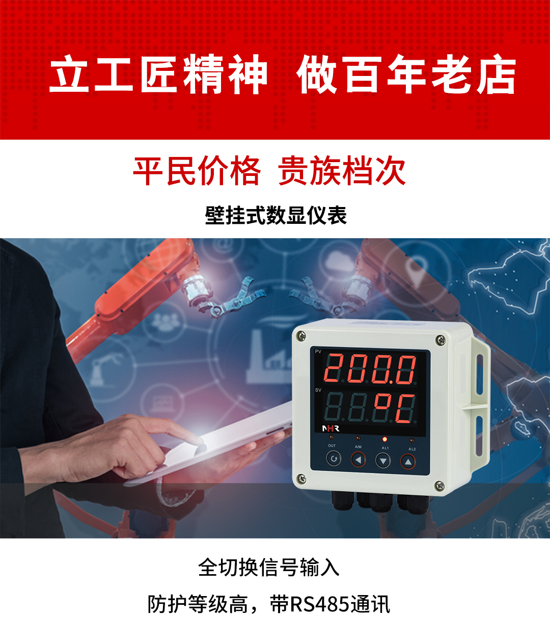 虹潤公司是專業(yè)生產數顯表的國家專精特新“小巨人”企業(yè),生產的壁掛式數顯儀表,具有全切換信號輸入,高抗干擾,IP65防護等級,全隔離設計,變送輸出或RS485通訊等特點。產品獲得巡回檢測顯示方法及裝置、工業(yè)模塊的導軌式安裝結構等2項國家發(fā)明專利,主持起草工業(yè)過程控制系統用模擬輸入兩位或多位輸出儀表、物聯網智能溫度儀表通用技術條件等2項國家標準,,以及通信系統多通道數據采集控制終端規(guī)范軍用標準,參與國際5G標準制定,取得簡易數顯儀表等3項相關軟件著作權。產品廣泛應用于電力、石化、冶金、化工、造紙、食品、輕工、制藥、熱處理、水處理、機械配套等各種工業(yè)現場。